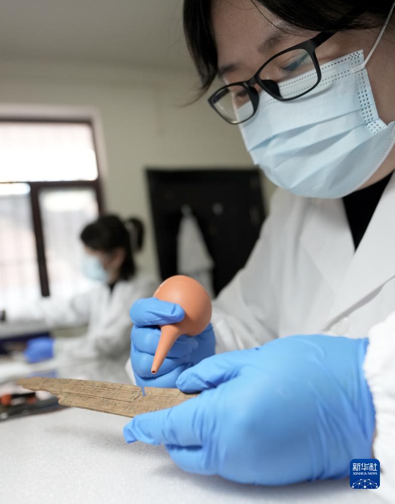 甘肅文博服務(wù)中心文物修復師李媛在清理簡(jiǎn)牘上灰塵(10月26日攝)。新華社記者 王毓國 攝