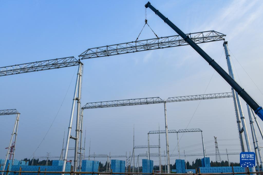這是11月28日在重慶市銅梁區少云鎮拍攝的銅梁1000千伏變電站構架吊裝作業(yè)現場(chǎng)。
