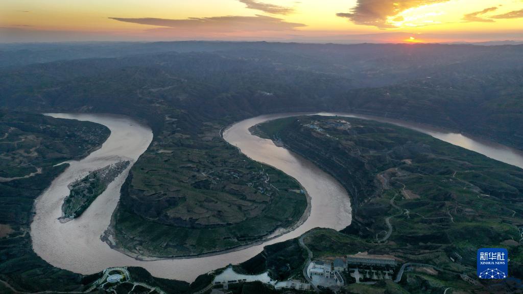 朝霞下的黃河乾坤灣(2019年8月14日攝,無(wú)人機照片)。新華社記者 陶明 攝