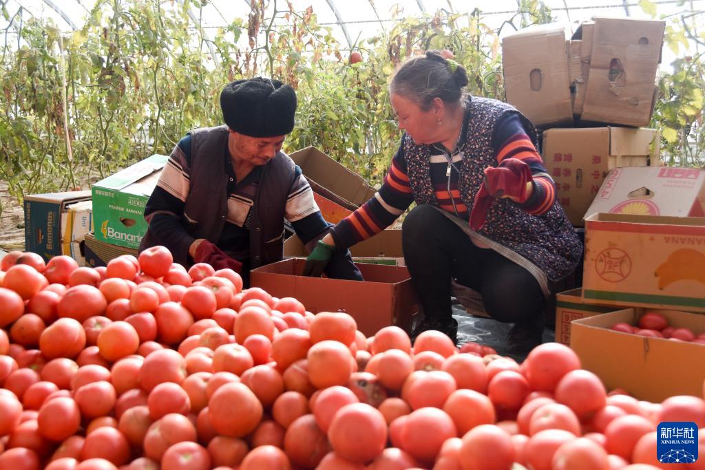 新疆葉城縣阿克塔什鎮居民吐遜馬木提·依明的父母將收獲的西紅柿裝箱(2021年11月19日攝)。新華社記者 顧煜 攝