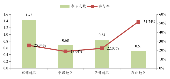 ↑四大區域冰雪運動(dòng)參與人數及參與率