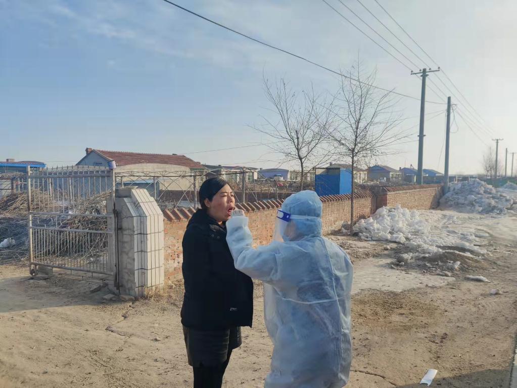 除夕當天,吉林省白城市通榆縣瞻榆鎮中心衛生院護士長(cháng)賈艷紅正在為村民做核酸取樣。(圖片由被采訪(fǎng)對象提供)