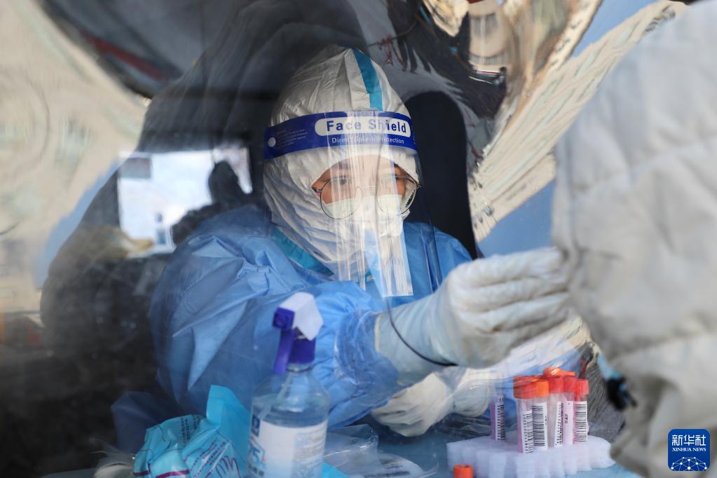 1月27日,在黑龍江綏芬河市一處核酸采集點(diǎn),醫護人員對居民進(jìn)行核酸采樣。新華社記者 徐凱鑫 攝
