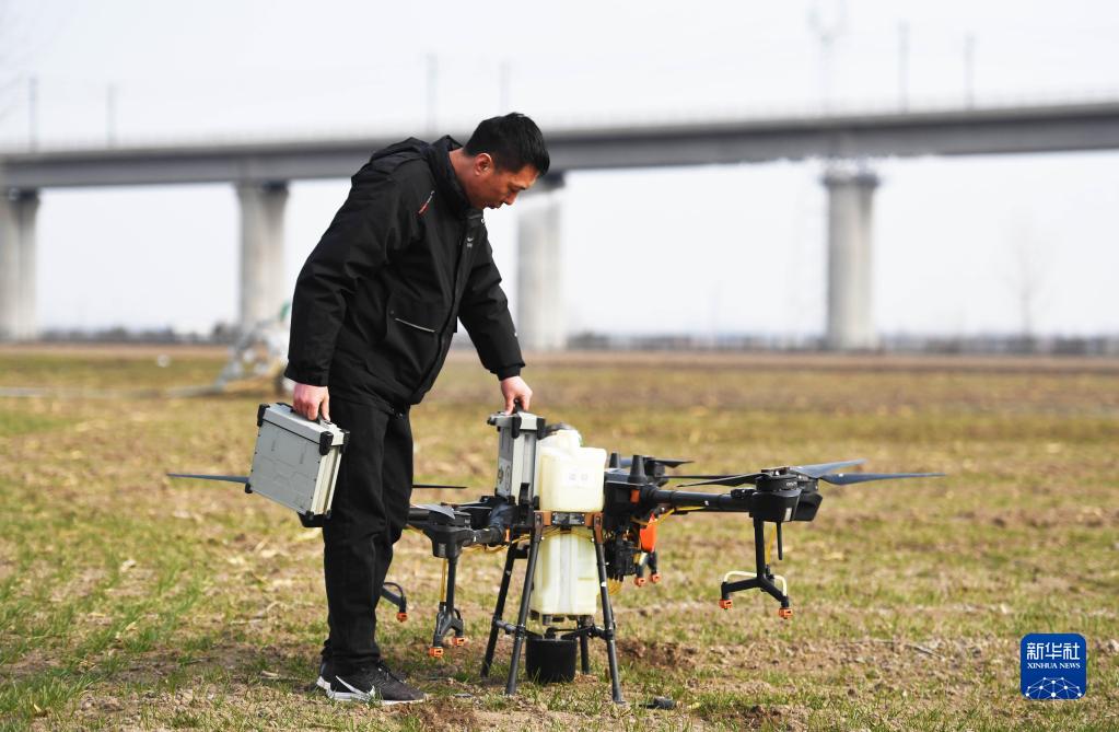 2月17日,在河南省安陽(yáng)市湯陰縣伏道鎮,農技人員為植保無(wú)人機更換電池。新華社記者 張浩然 攝