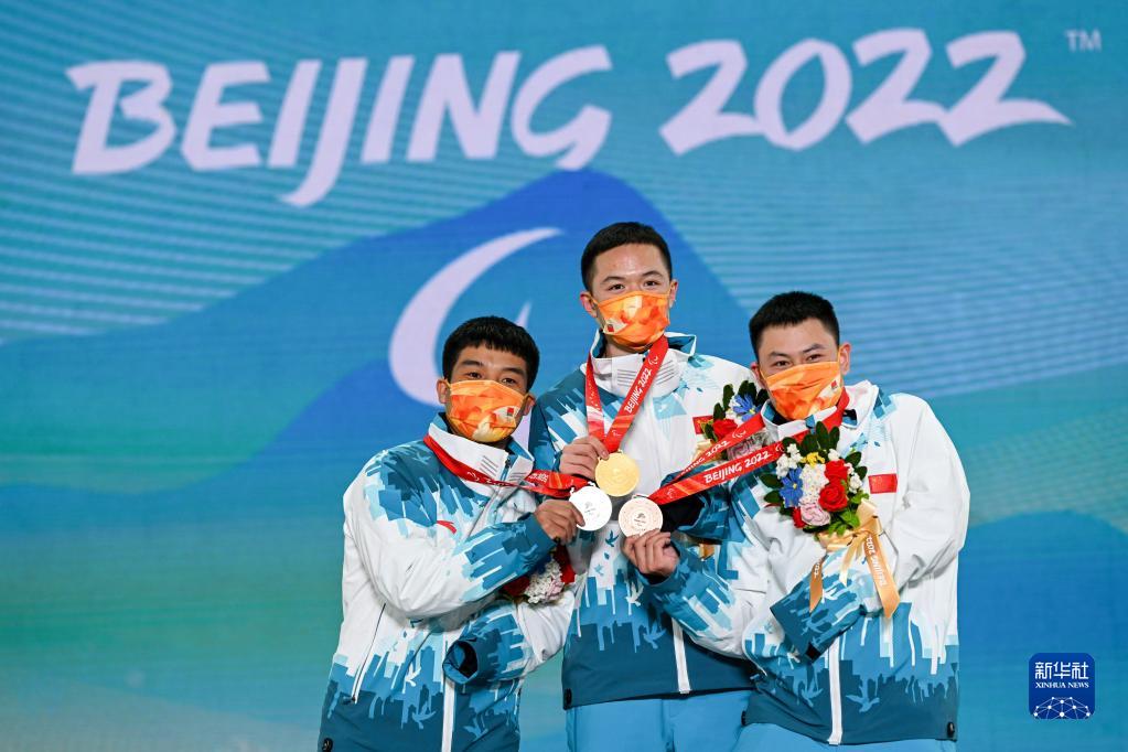 3月7日,中國選手冠軍紀立家(中)、亞軍王鵬耀(左)和季軍朱永鋼在北京2022年冬殘奧會(huì )殘奧單板滑雪男子障礙追逐(UL級)比賽獎牌頒發(fā)儀式上。新華社記者 胡超 攝