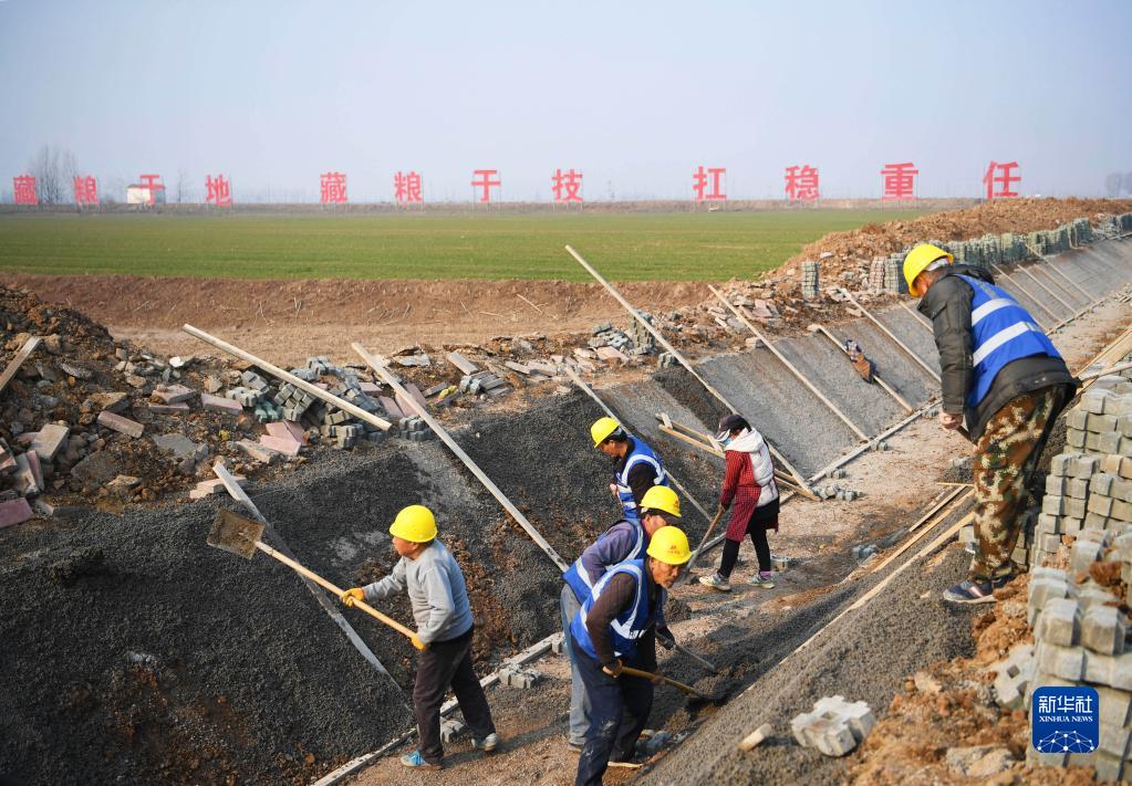 在河南省鶴壁市??h30萬(wàn)畝高標準農田示范方內,施工人員在修復去年水毀的溝渠(2月24日攝)。新華社記者 張浩然 攝