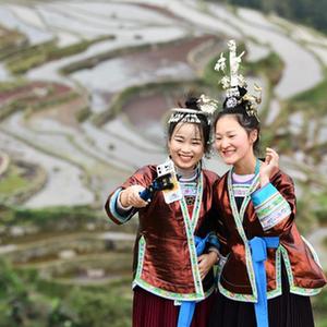 在貴州省從江縣加榜鄉加車(chē)村,脫貧攻堅指揮所網(wǎng)格員吳賢艷(左)與村里的大學(xué)女生梁瓊英在直播推介加榜梯田風(fēng)光(2020年4月19日攝)。新華社記者 楊文斌 攝