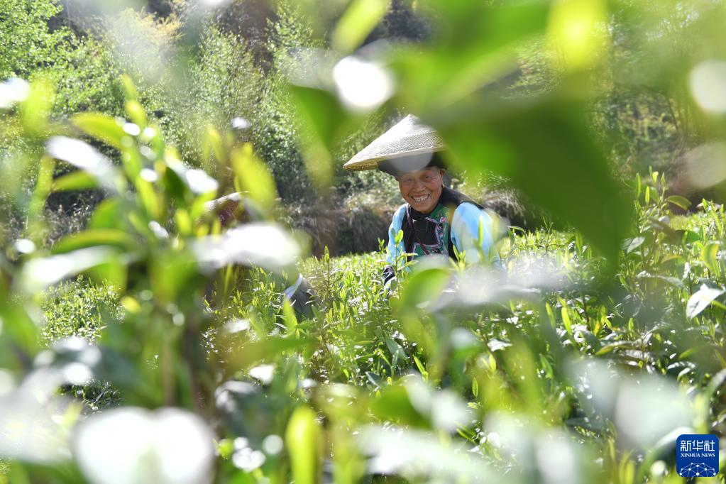 3月28日,幸福村的村民在采摘黃金茶。新華社記者 趙眾志 攝