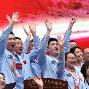 航天科研人員在北京航天飛行控制中心指揮大廳慶祝我國首次火星探測任務(wù)著(zhù)陸火星成功(2021年5月15日攝)。新華社記者 金立旺 攝