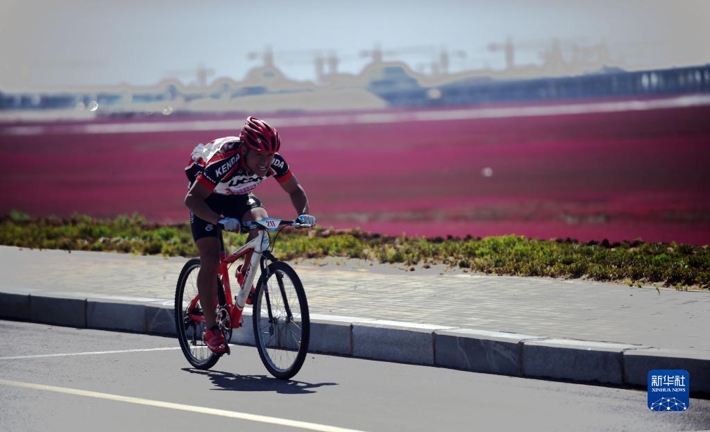 一名選手在盤(pán)錦紅海灘自行車(chē)邀請賽中騎行(2015年5月30日攝)。新華社記者 楊青 攝