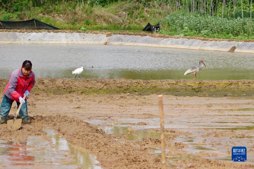 稻花香里說(shuō)豐年,聽(tīng)取蛙聲一片。在洋縣龍亭村,水田中,密密挨挨的牛蛙,靜待夏日放歌。61歲的龍亭村村民王金枝,在稻蛙共生示范基地里翻耕水田。兩只朱鹮輕輕落在身后覓食,隨著(zhù)王金枝的走動(dòng)來(lái)回踱步,時(shí)遠時(shí)近,形成了一幅人鳥(niǎo)和諧共處的躬耕圖。