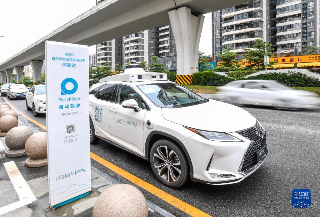 一輛由小馬智行運營(yíng)的自動(dòng)駕駛出租車(chē),在廣州南沙一個(gè)自動(dòng)駕駛??空镜却丝停?月15日攝)。新華社記者劉大偉攝