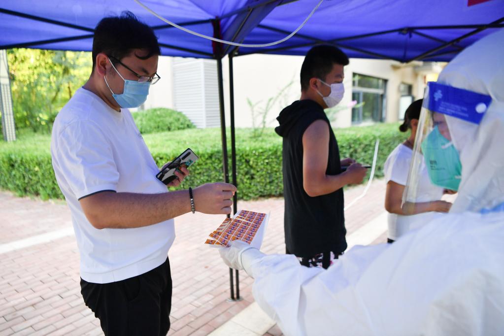 7月8日,志愿者(右)向西安市曲江新區紫汀苑社區居民發(fā)放核酸檢測貼紙。新華社記者 張博文 攝