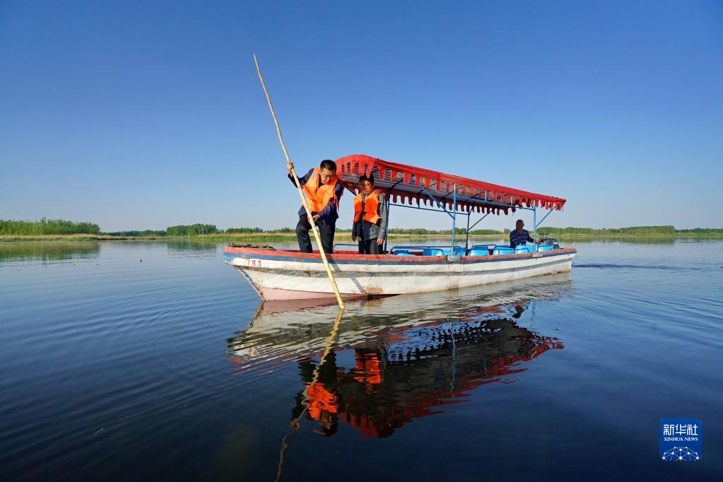 工作人員在白洋淀測量水位(2019年4月30日攝)。新華社記者 牟宇 攝