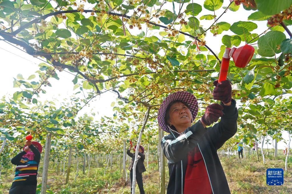 在位于江西宜春市奉新縣赤岸鎮城下村的“初心園”獼猴桃產(chǎn)業(yè)扶貧基地,村民為獼猴桃果樹(shù)進(jìn)行人工授粉(2020年4月29日攝)。新華社記者 萬(wàn)象 攝