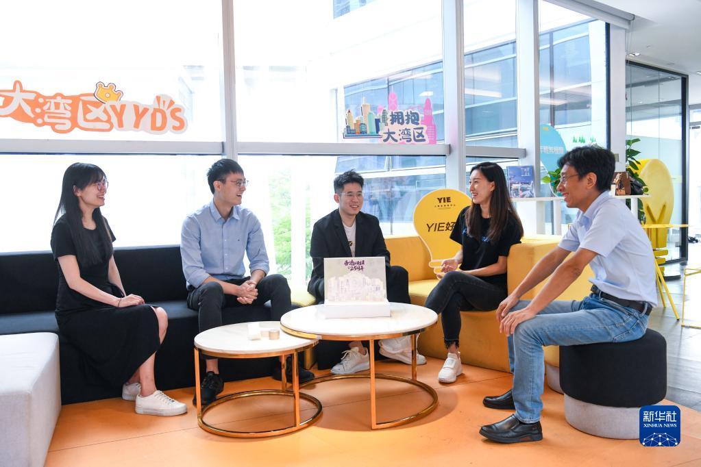 在位于深圳市的前海深港青年夢(mèng)工廠(chǎng),香港創(chuàng )業(yè)青年們一起交流各自的創(chuàng )業(yè)項目(2022年6月20日攝)。新華社記者 梁旭 攝