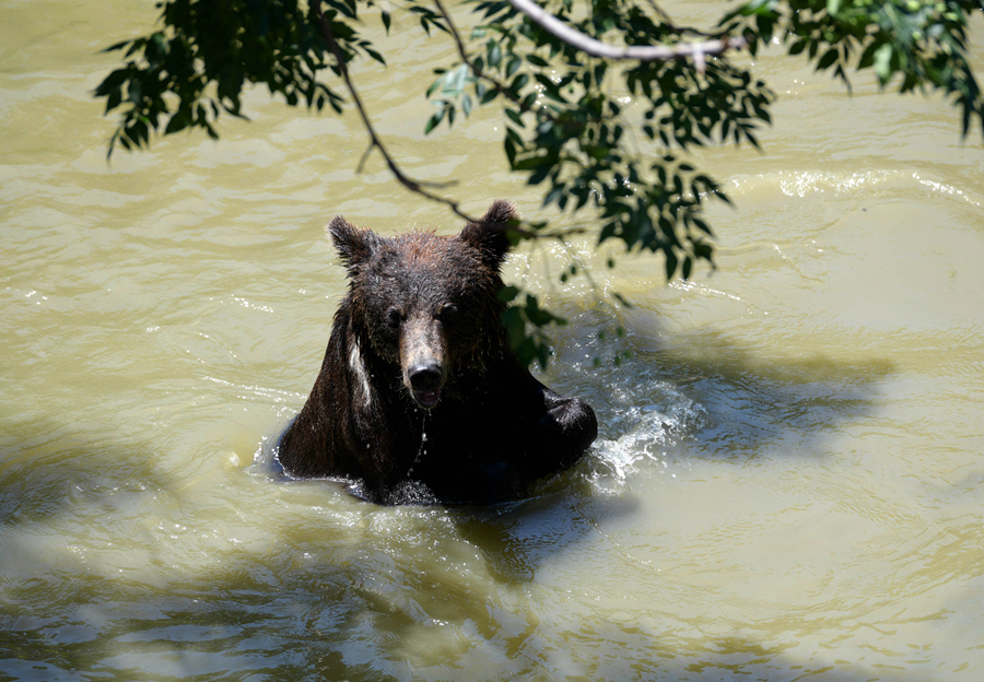 7月24日,石家莊市動(dòng)物園的棕熊在水中消暑。