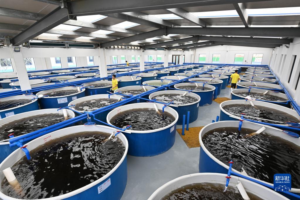 這是進(jìn)駐文昌市馮家灣現代化漁業(yè)產(chǎn)業(yè)園的渤海水產(chǎn)蝦苗養殖車(chē)間(2022年5月31日攝)。新華社記者 郭程 攝
