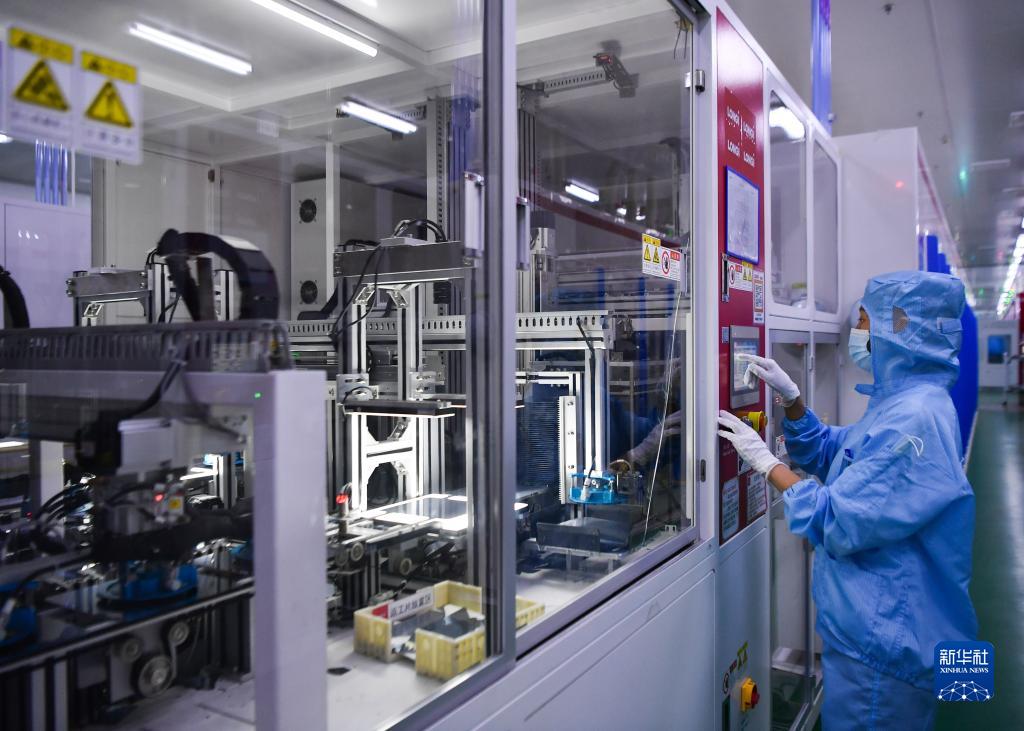 2022年7月19日,工作人員在位于陜西西安的隆基綠能科技股份有限公司單晶硅太陽(yáng)能電池工廠(chǎng)內調試設備。新華社記者 張博文 攝
