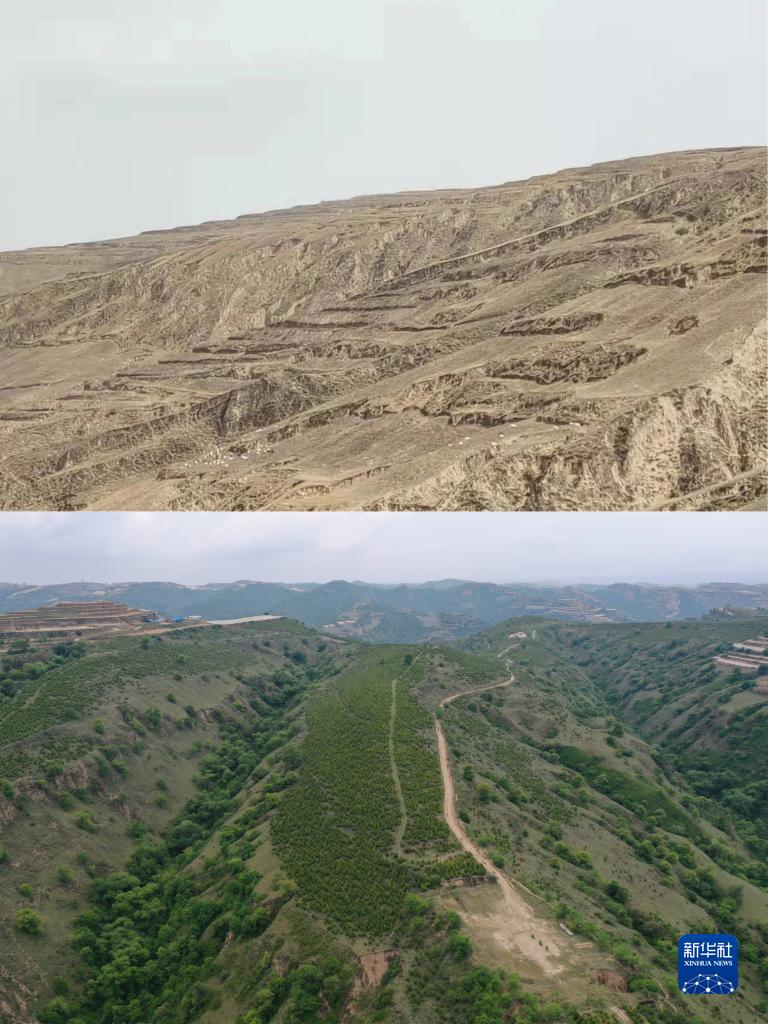 拼版照片:上圖為2013年拍攝的甘肅省慶陽(yáng)市華池縣南梁鎮高臺村荒山景象(資料圖片,華池縣自然資源局供圖);下圖為2022年5月25日拍攝的甘肅省慶陽(yáng)市華池縣南梁鎮高臺村萬(wàn)畝苗林示范點(diǎn)景象(無(wú)人機照片,新華社記者杜哲宇攝)。新華社發(fā)