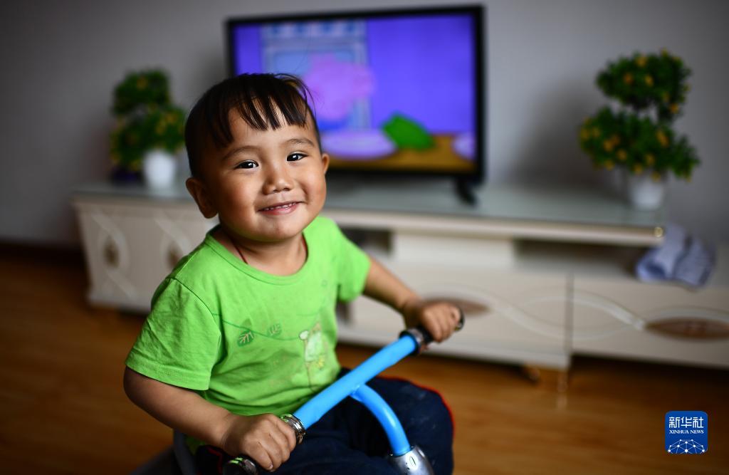 在青海省黃南藏族自治州河南蒙古族自治縣易地扶貧搬遷安置小區幸福家園,智后茂村牧民旦卻卓瑪的兒子羅藏智華在家中玩耍(2018年6月13日攝)。新華社記者 張宏祥 攝