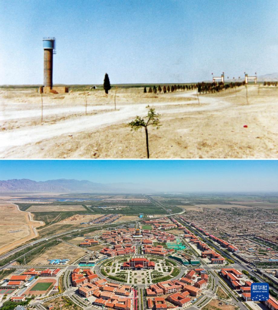 拼版照片:上圖為建設初期的寧夏永寧縣閩寧鎮景象(資料照片);下圖為2021年6月3日拍攝的寧夏永寧縣閩寧鎮(新華社記者馮開(kāi)華攝,無(wú)人機照片)。新華社發(fā)