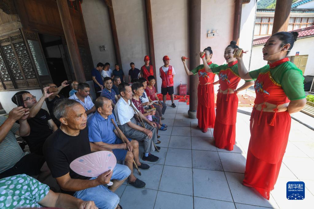 浙江省杭州市臨安區高虹鎮廉政文藝宣傳隊在石門(mén)村表演快板小段《清廉高虹》(2021年9月1日攝)。新華社記者 徐昱 攝