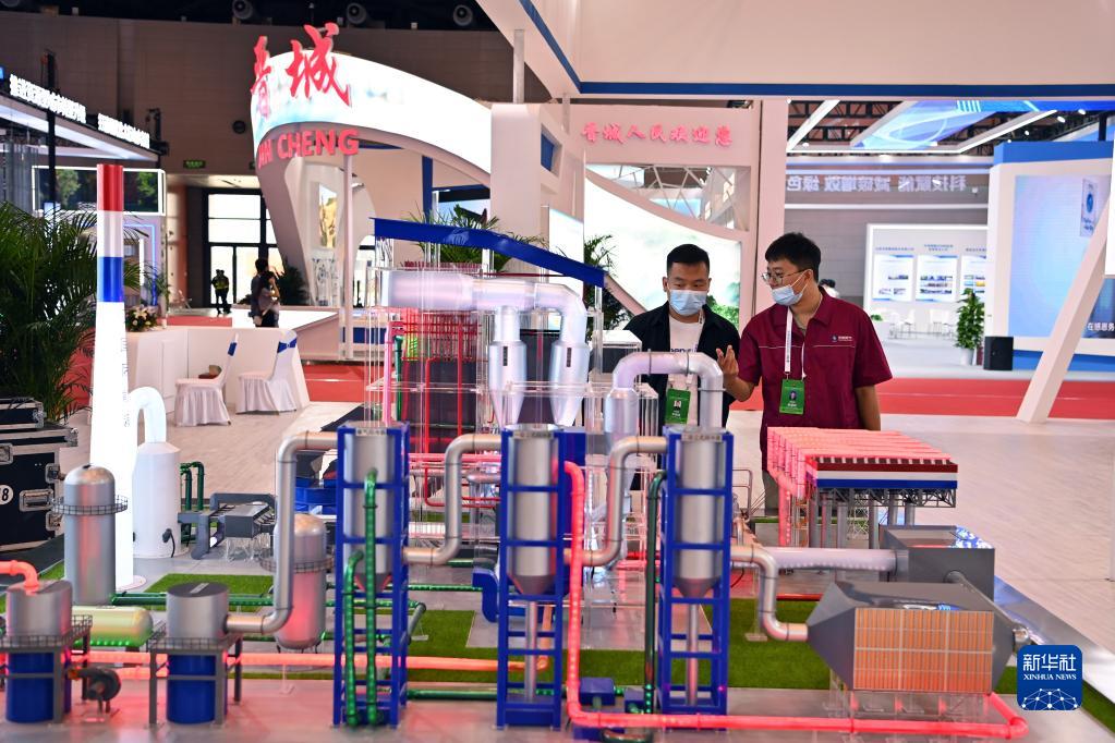 9月3日,在2022中國(太原)國際能源產(chǎn)業(yè)博覽會(huì ),參展商在格盟國際能源有限公司的展廳內交流。新華社記者 楊晨光 攝