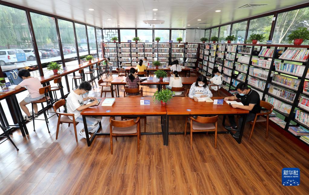 2021年8月21日,讀者在河北省石家莊市藁城區人民廣場(chǎng)“24小時(shí)智慧圖書(shū)館”內閱讀。新華社記者 駱學(xué)峰 攝