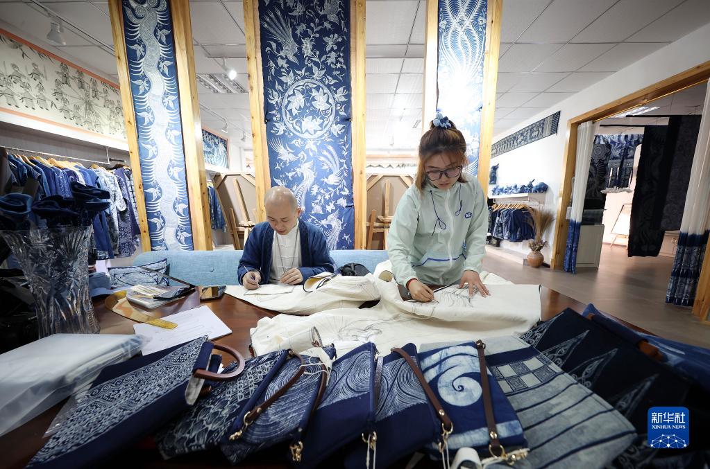 2022年4月7日,在貴州省黔東南苗族侗族自治州丹寨縣寧航蠟染非遺工坊,服飾設計師在設計蠟染產(chǎn)品。新華社發(fā)(黃曉海 攝)