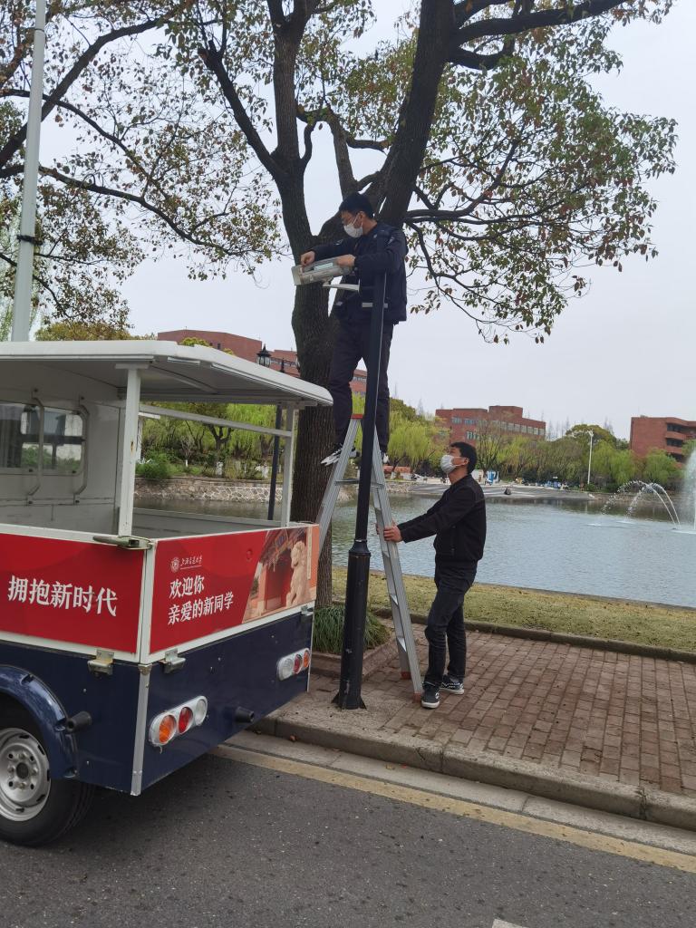 今年上海疫情防控期間,蔣家杰(左)巡查維保校園設備。受訪(fǎng)者供圖