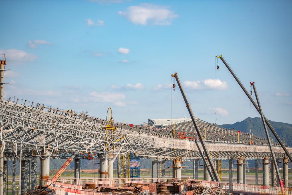 10月1日,在中建八局承建的重慶江北國際機場(chǎng)T3B航站樓施工現場(chǎng),上千名建設者堅守崗位作業(yè)。新華社記者 黃偉 攝