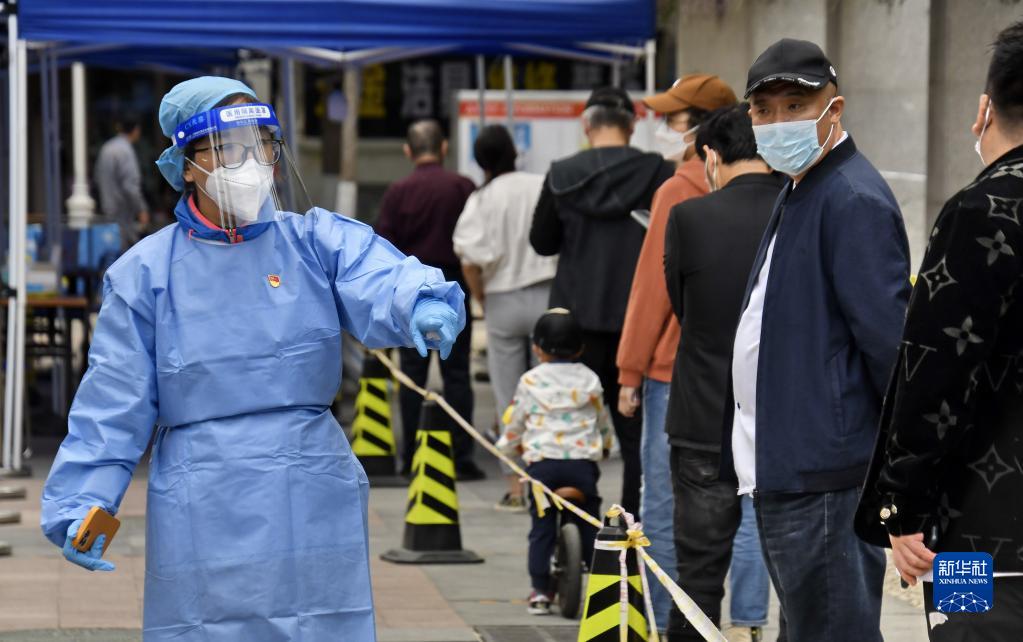 共產(chǎn)黨員、北京八里莊街道機關(guān)干部張茜(左)在核酸篩查現場(chǎng)進(jìn)行秩序維護(2022年5月11日攝)。新華社記者 李欣 攝
