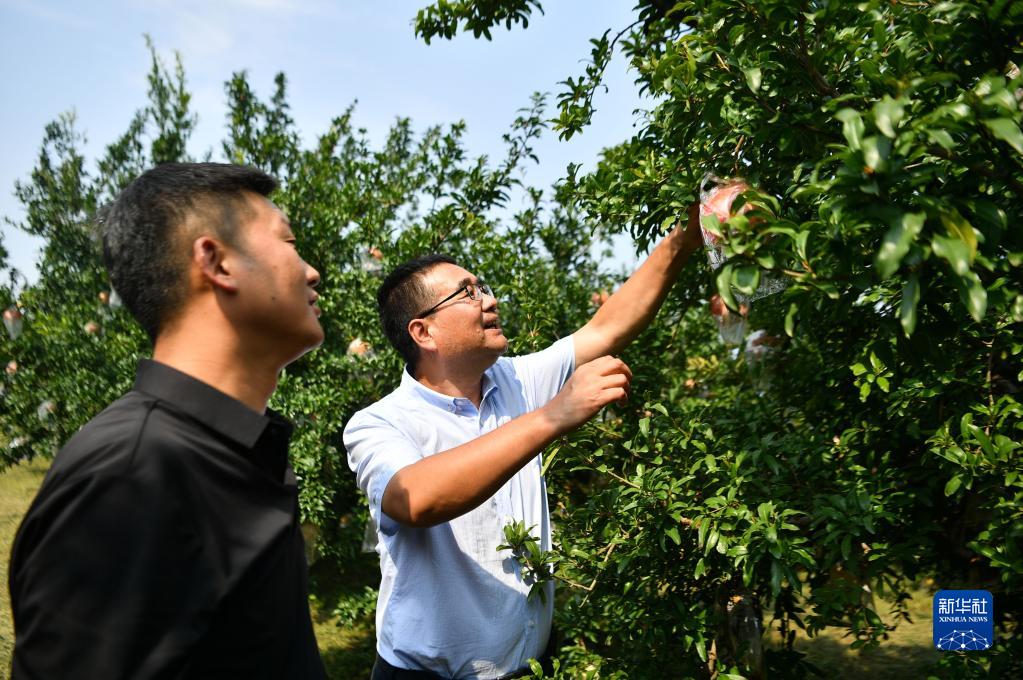 陜西省西安市臨潼區園藝工作站工作人員(右)與當地石榴種植大戶(hù)交流果品長(cháng)勢(2022年9月26日攝)。新華社記者 張博文 攝