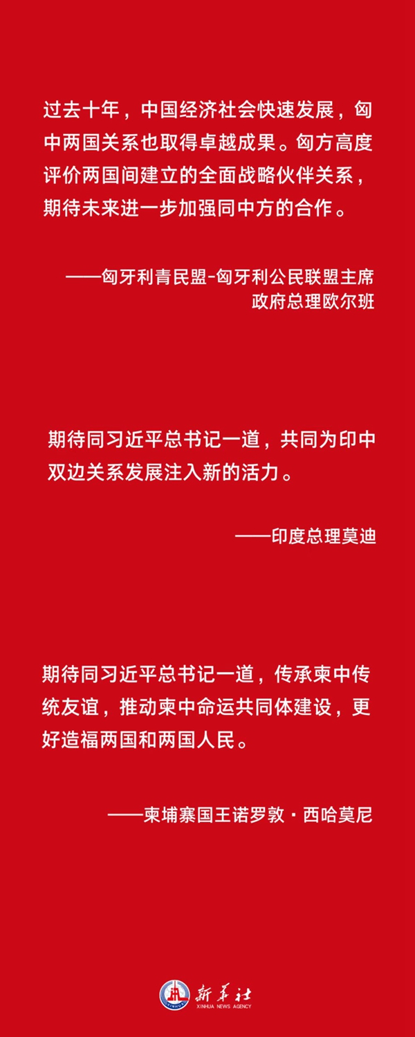 匈牙利青民盟-匈牙利公民聯(lián)盟主席、政府總理歐爾班表示,過(guò)去十年,中國經(jīng)濟社會(huì )快速發(fā)展,匈中兩國關(guān)系也取得卓越成果。匈方高度評價(jià)兩國間建立的全面戰略伙伴關(guān)系,期待未來(lái)進(jìn)一步加強同中方的合作。