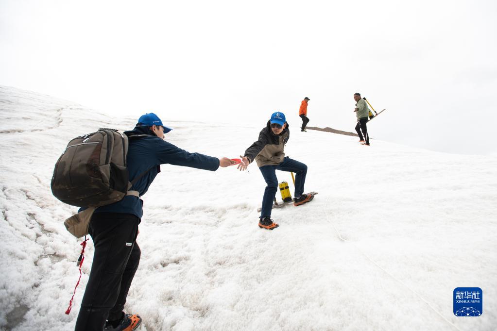 在長(cháng)江源各拉丹冬雪山,來(lái)自長(cháng)江科學(xué)院的科考隊員范越(左二)在搬運探測設備(2022年7月28日攝)。 新華社記者 肖藝九 攝