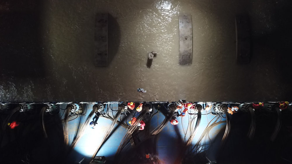 11月20日晚8點(diǎn)左右,“奮力”輪開(kāi)始提升古船。 “奮力”輪中央敞開(kāi)的巨大“月池”中,逐漸出現許多快速旋轉翻涌的水渦,工作人員有條不紊地操控著(zhù)兩邊的提升裝置。21日凌晨零時(shí)40分,在此起彼伏的快門(mén)聲中,長(cháng)江口二號古船斷裂的桅桿頂端露出了水面!