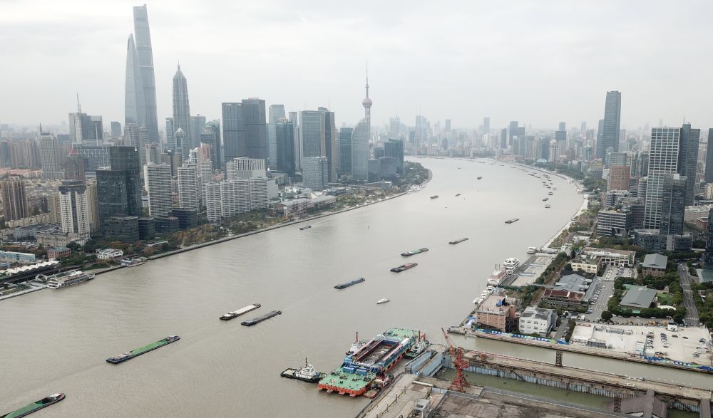 11月25日,裝載著(zhù)長(cháng)江口二號古船的“奮力”輪航行在黃浦江楊浦濱江水域。