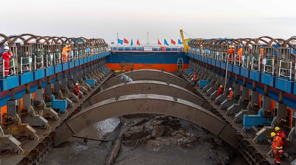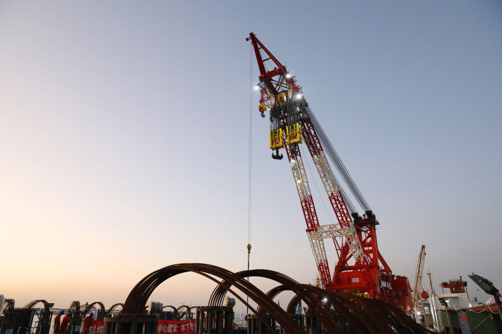 11月21日,工作人員下水給桅桿“穿上”保護衣。