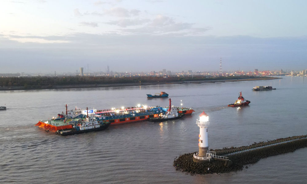 11月25日,裝載著(zhù)長(cháng)江口二號古船的“奮力”輪,在拖船牽引下航行在吳淞口水域。