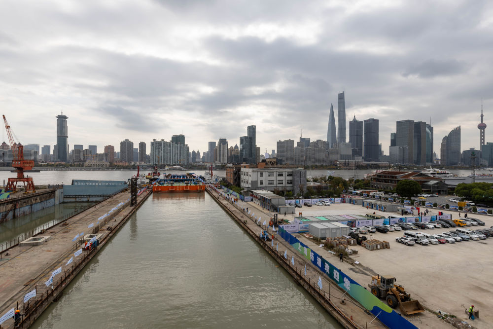 上海船廠(chǎng)舊址1號船塢已打開(kāi)閘門(mén),完成灌水,靜候長(cháng)江口二號古船(11月23日攝)。