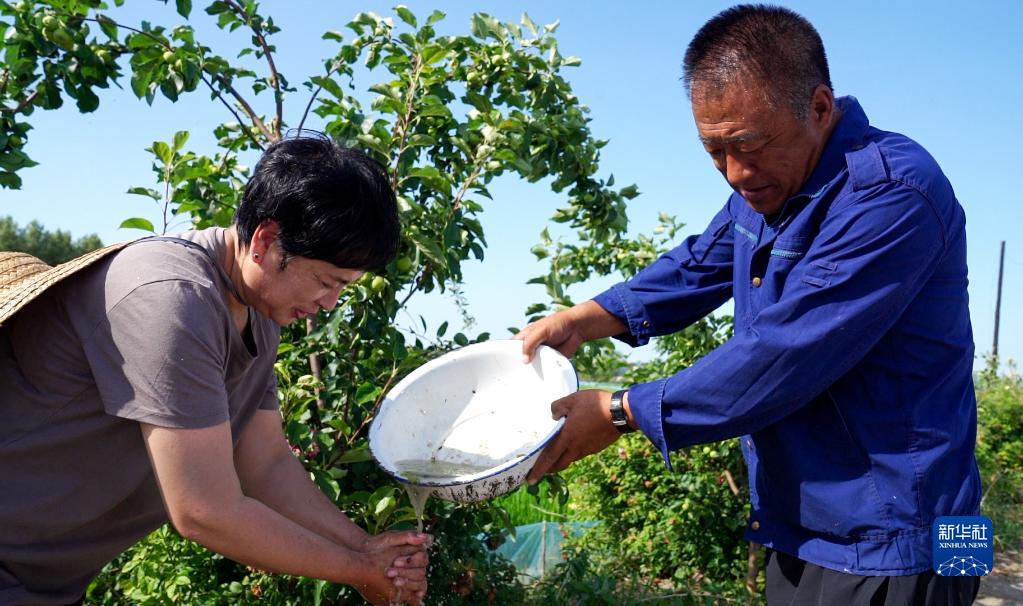 2022年7月12日,從稻田干完農活歸來(lái),孟慶江(右一)為妻子張瑞平(左一)倒水洗手。新華社記者 王帆 攝