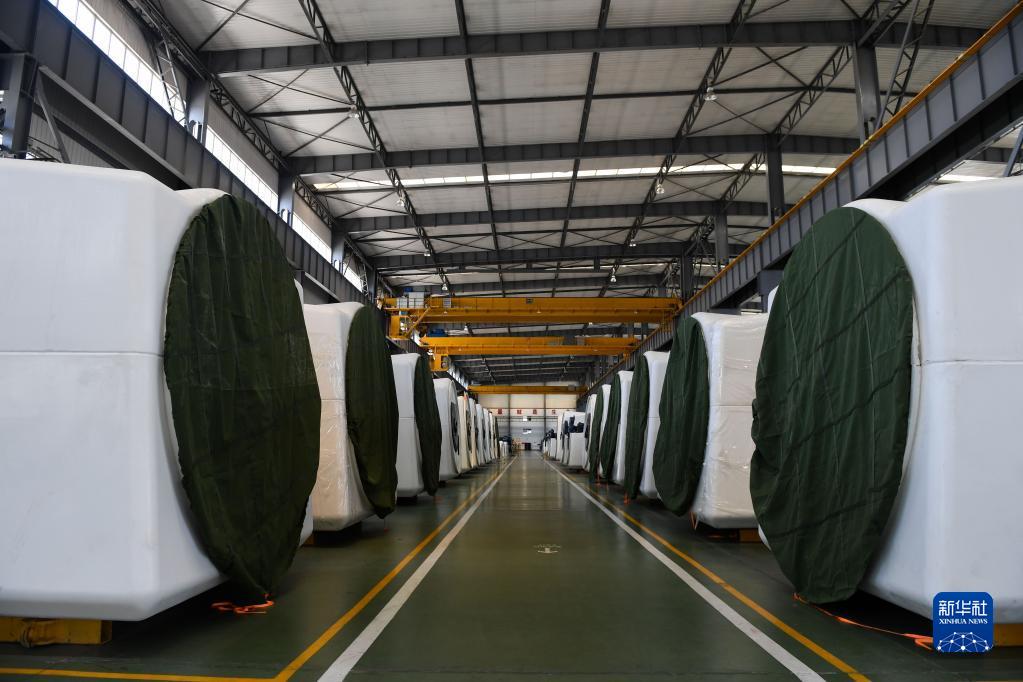 這是在內蒙古鄂爾多斯市一家能源裝備有限公司生產(chǎn)車(chē)間拍攝的準備出售的風(fēng)電機(2018年4月18日攝)。新華社記者 劉磊 攝