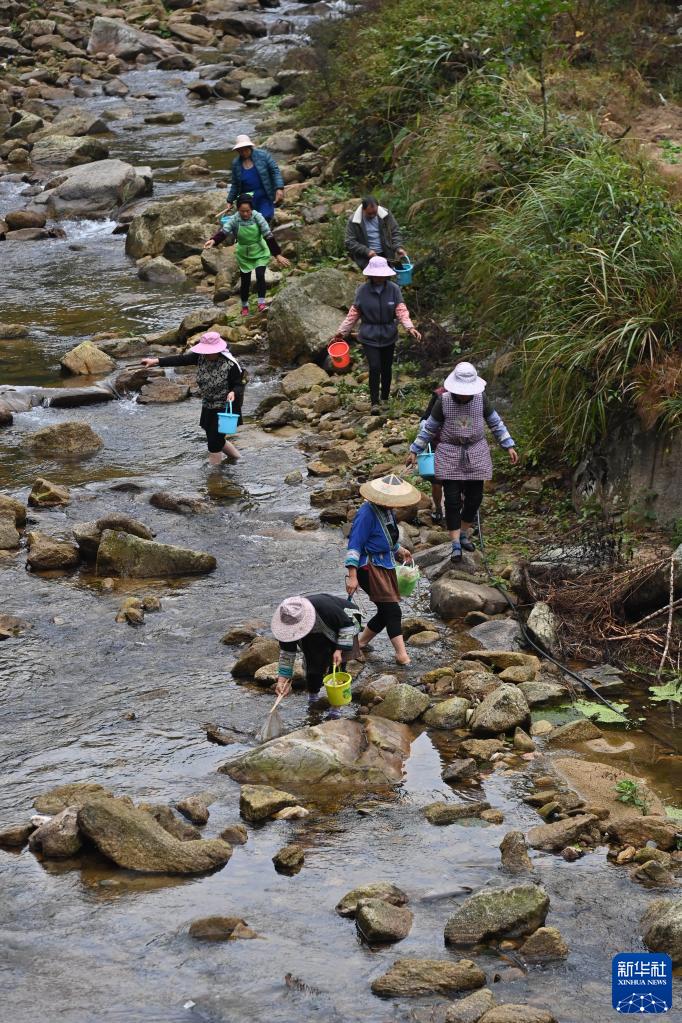 在廣西融水苗族自治縣桿洞鄉黨鳩村,村民在河長(cháng)的組織下清理烏嘎河垃圾(2022年11月19日攝)。新華社記者 黃孝邦 攝