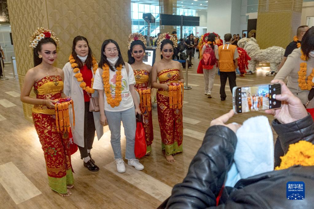 1月22日,在印度尼西亞巴厘島伍拉萊國際機場(chǎng),中國游客與歡迎儀式上的舞蹈演員合影。旅游勝地巴厘島當天迎來(lái)2023年首架中國游客包機。新華社發(fā)(比辛拉西攝)
