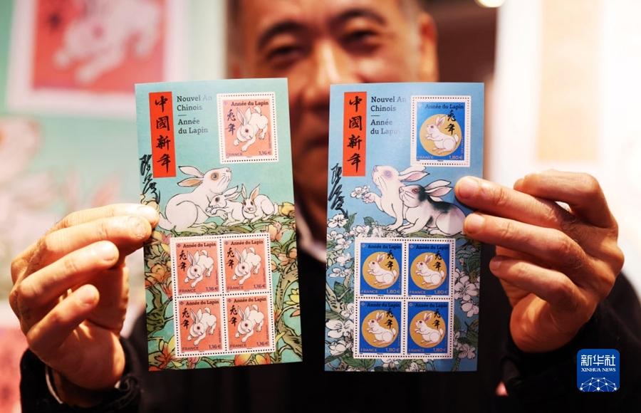 2023年1月14日,在法國巴黎舉行的兔年生肖郵票發(fā)行儀式上,郵票設計者陳江洪展示兔年生肖紀念郵票。新華社記者 高靜 攝
