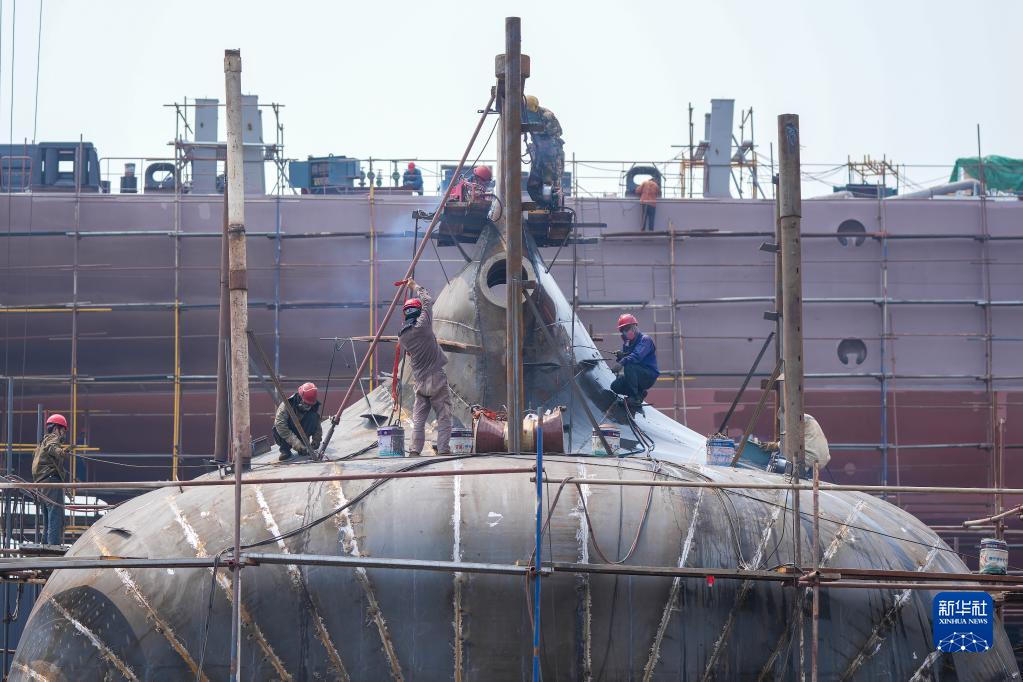 工程技術(shù)人員在位于山東省威海市的黃海造船有限公司廠(chǎng)區建造船舶(2022年5月20日攝)。新華社記者 朱崢 攝