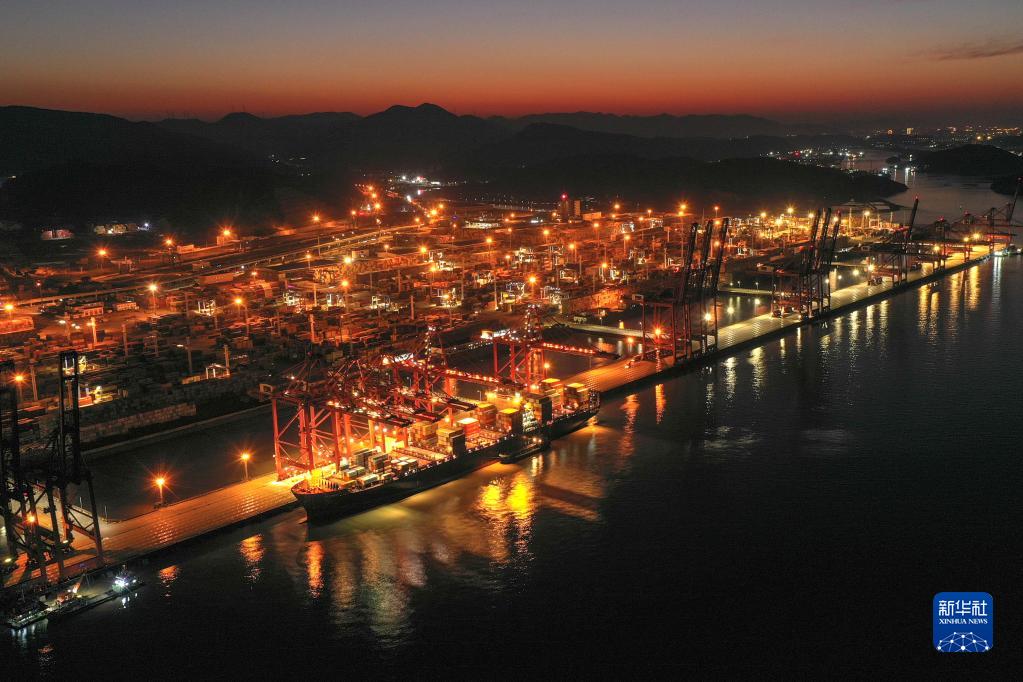 夜幕下,一艘貨輪??吭趯幉ㄖ凵礁鄞┥礁蹍^集裝箱碼頭(1月31日攝,無(wú)人機照片)。新華社記者 黃宗治 攝