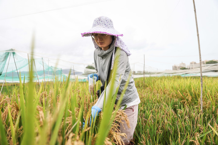 2022年4月,工作人員在南繁科研育種基地收集水稻種子。新華社記者張麗蕓 攝