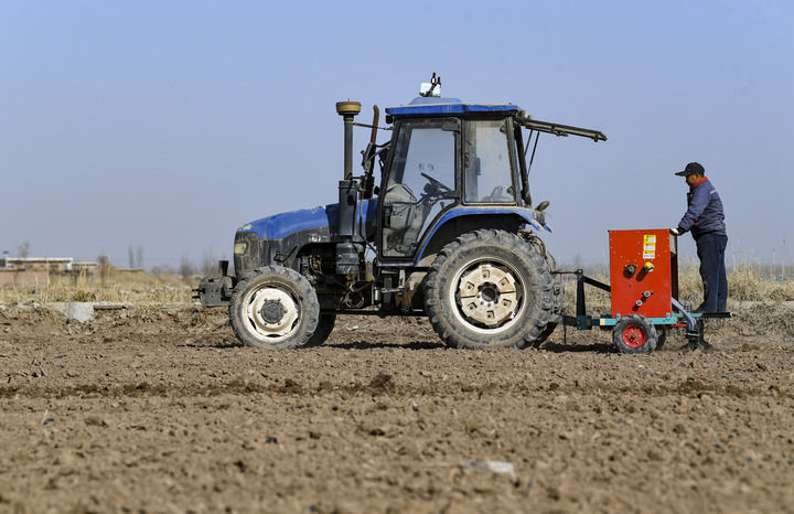 2023年3月3日,在寧夏銀川市賀蘭縣立崗鎮銀星村,一臺裝有北斗導航系統的無(wú)人駕駛播種機進(jìn)行播種作業(yè)。新華社記者 馮開(kāi)華 攝